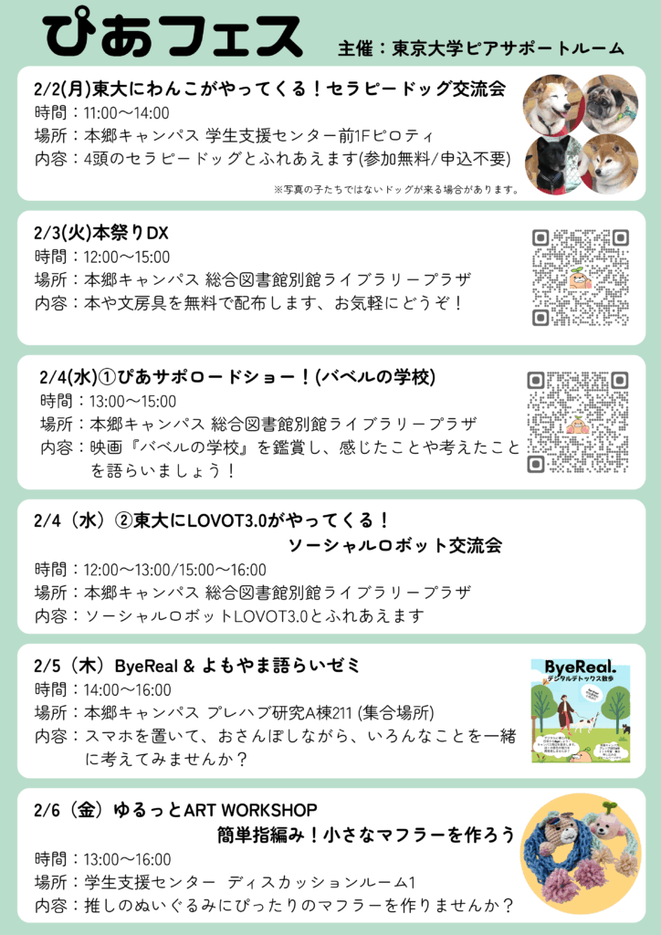 東京大学ピアサポートルームは、学生同士が支え合うキャンパスづくりを目指して活動してきました。皆様の支えのおかげで、当機関は2025年に発足10周年を迎えました。これを記念して、2026年2/2(月)~2/6(金)の1週間、日替わりで毎日イベントを開催します!当機関がこれまで行ってきたイベントをリバイバルし、盛りだくさんの内容となっています。初めて参加される方も大歓迎ですので、ぜひお気軽にお立ち寄りください!