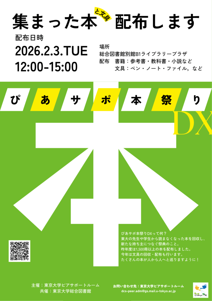 東京大学ピアサポートルーム本祭りチームでは、2/3(火)にライブラリープラザで「ぴあサポ本祭りDX」を開催します!